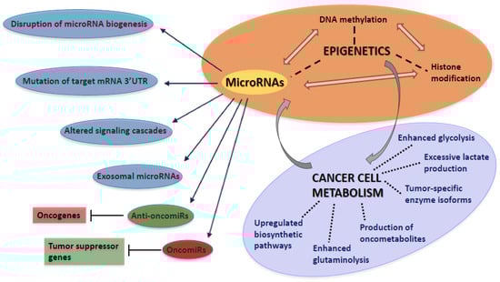 Since the well-known hallmarks of cancer were described by Hanahan and Weinberg, fundamental advances of molecular genomic technologies resulted in the discovery of novel puzzle pieces in the multistep pathogenesis of cancer. MicroRNAs are involved in the altered epigenetic pattern and metabolic phenotype of malignantly transformed cells. They contribute to the initiation, progression and metastasis-formation of cancers, also interacting with oncogenes, tumor-suppressor genes and epigenetic modifiers. Metabolic reprogramming of cancer cells results from the dysregulation of a complex network, in which microRNAs are located at central hubs. MicroRNAs regulate the expression of several metabolic enzymes, including tumor-specific isoforms. Therefore, they have a direct impact on the levels of metabolites, also influencing epigenetic pattern due to the metabolite cofactors of chromatin modifiers. Targets of microRNAs include numerous epigenetic enzymes, such as sirtuins, which are key regulators of cellular metabolic homeostasis. A better understanding of reversible epigenetic and metabolic alterations opened up new horizons in the personalized treatment of cancer. MicroRNA expression levels can be utilized in differential diagnosis, prognosis stratification and prediction of chemoresistance. The therapeutic modulation of microRNA levels is an area of particular interest that provides a promising tool for restoring altered metabolism of cancer cells.