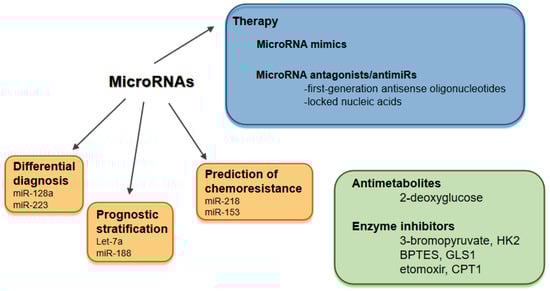 There are further promising clinical applications of microRNAs, including differential diagnosis, prediction of prognosis and chemoresistance. Based on the expression level of four microRNAs (miR-128a, miR-128b, let-7b and miR-223), ALL and AML can be distinguished with high accuracy (97–99%) [128]. MicroRNA expression levels can be utilized in the early detection of bladder cancer [129] and in the differential diagnosis of non-small cell lung carcinoma [130]. Let-7a and miR-188 are prognostic biomarkers in cytogenetically normal AML [131]. A six-microRNA-based model has been described to improve prognosis prediction in breast cancer [132], and a five-microRNA-based signature was identified to have a significant prognostic value in colon cancer [133]. Downregulation of miR-181a was associated with cytarabine resistance in HL60 cells, due to reduced targeting of the BCL2 oncogene [134]. In glioma cell lines, miR-16 was confirmed to modulate temozolomide resistance by regulating BCL2 [135]. MicroRNAs have also been identified in exosomes, which can be taken up by neighboring or distant cells [136]. Exosomal microRNAs are involved in cancer progression and metastasis formation [136], they are ligands of toll-like receptors and activate immune cells [137]. A special circular RNA, hsa_circ_0005963 (ciRS-122), is a sponge for the PKM2-targeting miR-122. Exosomes from oxaliplatin-resistant colorectal cancer cells delivered ciRS-122 to sensitive cells, thereby promoting glycolysis and chemoresistance [138]. Clinical applications of microRNAs and therapeutic approaches to counteract Warburg effect are summarized in Figure 2.
