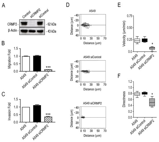 As a preliminary attempt to assess whether CRMP2 is relevant for lung carcinoma cell migration, we silenced its expression by transiently transfecting A549 lung carcinoma cells with commercially available CRMP2-specific siRNAs (Figure 1A and Supplementary Figure S1). Please note that, in our experience, it is impossible to stably silence CRMP2 in adenocarcinoma cells since it induces p53 activation and cell death []. In CRMP2 silenced A549 cells, we analyzed cell migration through Boyden chambers and invasion through the Boyden chambers covered with Matrigel hydrogels. Furthermore, cell speed (µm/min) and directionality were quantified in confocal microscopy time-lapse videos obtained during wound healing assays. Overall, CRMP2 silenced cells showed reduced migration, and invasive capabilities, and altered migration directionality, compared to their wild-type controls (Figure 1B–F).