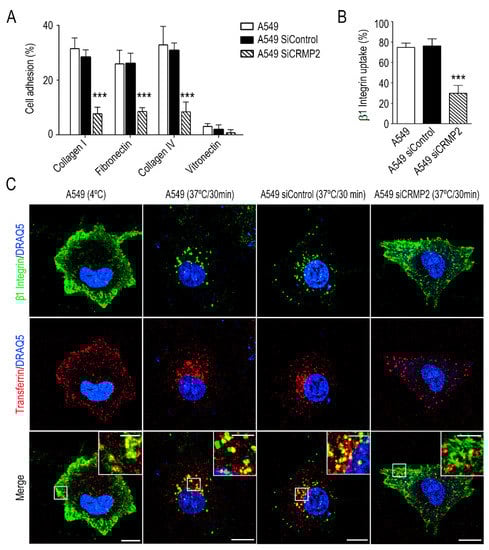 CRMP2 participates in cell adhesion and integrin β1 recycling. (A) Cell adhesion of A549 cells transfected with CRMP2-specific or non-target siRNA sequences (25 μM) to collagen I (50 μg/mL), collagen IV (50 μg/mL), fibronectin (10 μg/mL) and vitronectin (1 μg/mL) coated substrates. Data are shown as the percentage of cell adhesion relative to BSA. (n = 12); (B) quantification of β1 integrin uptake by flow cytometry in the different cell lines analyzed. Data are shown as the percentage of internalized β1 integrin relative to membrane expression at 4 °C. (n = 3); (C) representative maximum intensity projections confocal images of A549 cells stained with β1 integrin (green), transferrin (red), and DRAQ5 (blue). Integrin uptake was stimulated for 30 min at 37 °C in serum-free media. Vesicle internalization was blocked at 4 °C. Scale bar = 15 microns. White insets show magnified areas with strong integrin β1 and transferrin co-localization. Scale bar = 5 microns. *** (p < 0.001).