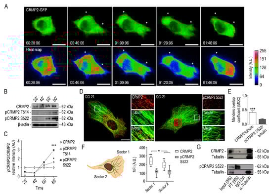 CRMP2 distributes along the lamella of migrating cells. (A) Representative confocal images and heat maps of cytoplasmic CRMP2-GFP distribution in A549 cells after CCL21 stimulation (200 ng/mL). Cell migration was captured by confocal video-microscopy with images taken every 2 min for 2 h. Heat maps were rendered using the ImageJ software. White asterisks signal CRMP2 enriched areas at the lamella. Scale bar = 20 microns. (Number of videos, n = 10); (B) western blot analysis of CRMP2 and pCRMP2 S522 expression from protein extracts obtained from isolated lamellipodia at the time points indicated. β-Actin was used as a Western blot loading control. (Number of blots, n = 3); (C) quantification of CRMP2 and pCRMP2 S522 expression levels from total protein extracts shown in (B) (Arbitrary Units, AU). Each sample was normalized to GAPDH expression and, subsequently, to CRMP2 expression; (D) representative maximum intensity projections confocal images of actively migrating A549 cells after CCL21 stimulation (200 ng/mL) and stained with specific antibodies to detect tubulin (green), CRMP2 or pCRMP2 S522 (red). Scale bar = 10 microns. White insets show enlarged areas with strong tubulin and CRMP2 or pCRMP2 S522 co-localization at the lamella. Scale bar = 5 microns; (E) Manders’ overlap coefficient (MOC) between tubulin and CRMP2 or pCRMP2 S522 positive signal from images shown in (D). (Number of images, n = 50); (F) quantification of CRMP2 or pCRMP2 S522 distribution in Sector 1 and Sector 2 from images shown in (D) following the schema shown on the left. Each cell was segmented into two sectors (120°): Sector 1 comprises the leading edge, and Sector 2 the rear edge. (Number of images, n = 50); (G) immunoprecipitation of tubulin and CRMP2 or pCRMP2 S522 from total protein extracts obtained from A549 cells after serum stimulation. (Number of blots, n = 3). *** (p < 0.001). ** (p < 0.01). * (p < 0.05).
