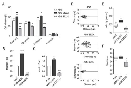 Invasion and adhesion of A549 cells expressing CRMP2 phosphorylation mutant forms. (A) Cell adhesion to collagen I (50 μg/mL), collagen IV 50 μg/mL), fibronectin (10 μg/mL) and vitronectin (1 μg/mL) coated surfaces. Results are shown as the percentage of cell adhesion relative to BSA. (Number of wells, n = 12); (B) Boyden migration assays towards cell media containing 20% FBS. Data are shown as a fold ratio over wild-type A549 cells. (Number of images, n = 12); (C) cell invasion assays across Matrigel hydrogel coated Boyden chambers. Data are shown as a fold-ratio over wild-type A549 cells. (Number of images, n = 12); (D) single representative cell tracks of cell movement during wound-healing assays. Cell migration was captured by confocal video-microscopy every 10 min during 12 h. (Number of videos, n = 3); (E,F) quantification of cell speed (μm/min) and directness from videos shown in (D) using the Chemotaxis and Migration software. (Number of cells, n = 60). *** (p < 0.001). ** (p < 0.01). * (p < 0.05).