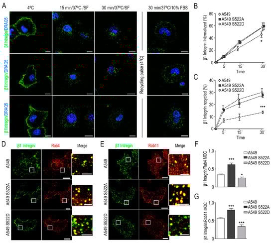 Constitutive phosphorylation of CRMP2 prevents β1 integrin recycling. (A) Representative confocal images depicting maximum intensity projections of cells stained with anti-β1 integrin antibody (green) and DRAQ5 (blue). Integrin β1 uptake was stimulated at indicated time points (15 and 30 min) at 37 °C in serum-free media. Integrin β1 recycling cells were exposed to a pulse of cold at 4 °C and immediately stimulated at 37 °C in complete cell culture media for 30 min. Vesicle internalization was blocked by exposure of cell to 4 °C; (B) detection of β1 integrin uptake by flow cytometry at the indicated time points (5-, 15-, and 30 min). Data are shown as the percentage of internalized β1 integrin relative to its membrane expression at 4 °C. (n = 3); (C) quantification of the rate of β1 integrin recycling by flow cytometry at 5-, 15-, and 30 min after serum stimulation. Data are shown as the percentage of cell surface β1 integrin relative to the percentage of intracellular β1 integrin 30 min after exposure to serum-free media at 37 °C; (D,E) representative confocal images of maximum intensity projections after staining with anti-β1 integrin (green) and anti-Rab4 or anti Rab11 (red) antibodies. Integrin uptake was stimulated for 5 or 15 min at 37 °C in serum-free media. Scale bar = 10 microns. White insets show enlarged areas with evident co-localization. Scale bar = 5 microns; (F,G) Manders’ overlap coefficient (MOC) between β1 integrin and Rab4 or Rab11 positive signal from images shown in (D,E), respectively. (Number of cells, n = 100). *** (p < 0.001). * (p < 0.05).