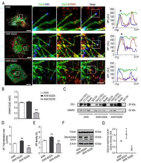 Our data demonstrate how CRMP2 intervention in the migration of lung adenocarcinoma cells is related to its participation in tubulin stabilization at the leading edge. During lamella protrusion, MTs attach to the cell membrane through IQGAP1/APC complexes and form thick MT bundles enriched in +TIP binding proteins that include CLASP170, EB1, and dynein []. Our work demonstrates the interaction between CRMP2, IQGAP1, and EB1 in close contact with the cell membrane. Most importantly, in CRMP2 S522D clones, MTs bent under the cell membrane, and IQGAP1 was not present at the cell cortex nor co-stained with tubulin. This outcome follows the same pattern and probably the exact molecular mechanisms described for CLASP2 phosphorylation by GSK-3β [,] and suggests that CRMP2 may form part of the same protein complexes.