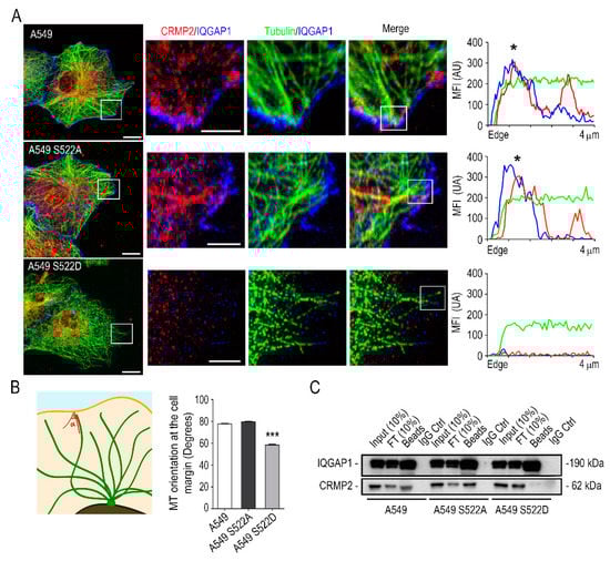 We further studied the interaction between CRMP2, tubulin and IQGAP1 in the cell membrane by confocal microscopy. As shown in Figure 7A, IQGAP1 distributes in a dotted pattern at the cell membrane of control cells, close to the MTs tip. In these cells, co-localization of CRMP2 and IQGAP at the cellular edge is clearly visible. The analysis of IQGAP1 localization in the CRMP2 phosphorylation-resistant mutants (S522A) rendered more intense staining at the cell membrane. In addition, CRMP2 phosphorylation-mimetic (S522D) mutants showed scarce events of IQGAP1 staining at the cell membrane and lower presence of CRMP2 along the microtubule. When we studied the fluorescence intensities for IQGAP1, CRMP2 and tubulin staining five microns under the cell surface we could not observe any co-signaling for CRMP2 and IQGAP1 in cells expressing phosphomimetic forms of CRMP2. Besides, a high proportion of the MTs bent under the cell membrane (Figure 7B), denoting impaired attachment to the cell surface. We performed immunoprecipitation assays to detect CRMP2 and IQGAP1 interaction using protein extracts from migrating A549 NSCLC cells that confirmed the absence of CRMP2-IQGAP1 interaction in CRMP2 phosphorylation-mimetic (S522D) mutants (Figure 7C).