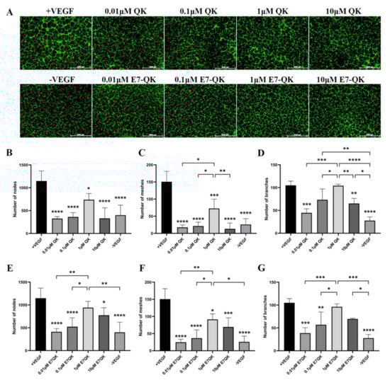 Tube formation of HUVECs incubated with different concentrations of VEGF and VEGF mimicry peptides (QK and E7-QK). HUVECs seeded on Geltrex matrix in medium containing different concentrations of QK or E7-QK peptide (0.01 µM, 0.1 µM, 1 µM, 10 µM), VEGF (0.5 ng/mL, positive control group), or without VEGF or peptides (negative control group). (A) Representative images (1.25× magnification, scale bar = 2000 µm) of tube formation were taken using fluorescent microscopy (Calcein AM) at 8 h after cell seeding. (B,E) Number of nodes, (C,F) number of meshes, and (D,G) number of branches were quantified with the ImageJ software. Values represent means ± SD from 3 independent experiments (*, **, ***, **** without bar indicates significant differences to the +VEGF group; * p < 0.05, ** p < 0.01, *** p < 0.001, **** p < 0.0001).