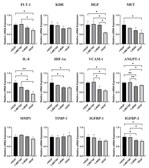 RNA was isolated from HUVECs using the NucleoSpin RNA kit (Macherey-Nagel, Hoerd, France) according to the manufacturer’s guidelines. After isolation, RNA was quantified using a Nanodrop micro-volume spectrophotometer (Invitrogen/Thermo Fisher Scientific, Waltham, MA, USA). Then, cDNA synthesis was performed using the SuperScript™ VILO™ cDNA synthesis kit according to the instructions of the manufacturer (Invitrogen/Thermo Fisher Scientific, Waltham, MA, USA). To quantify mRNA expression levels, the real-time LightCycler System (Roche Diagnostics, Mannheim, Germany) was used. For the PCR reactions, DEPC-treated water, DNA Master SYBR Green I kit (Roche, Mannheim, Germany), and commercial primer kits (FLT-1, KDR, HGF, MET, IL-8, HIF-1α, MMP-1, TIMP-1, IGFBP-1, IGFBP-2, VCAM-1, and ANGPT-1) from Search LC (Heidelberg, Germany) were used for 40 amplification cycles of the target cDNA following the manufacturer’s instructions. The target gene transcript levels were normalized to those of the housekeeping gene GAPDH. X-fold induction values were calculated related to the corresponding control. All cDNA samples (from 3 independent experiments) for each experimental group (+VEGF (positive control), 1 µM E7-QK, 1 µM QK, −VEGF (negative control)) were analyzed in triplicates.