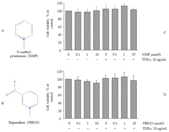 The effect of N-methyl-pyridinium (NMP) and trigonelline (TRIGO) treatment on cell viability. (A) Chemical structure of NMP; (B) Chemical structure of TRIGO. Adipocytes were treated with NMP (C) or TRIGO (D) for 5 h at the concentrations indicated, and then either treated with 10 ng/mL TNF-α or left untreated for 18 h. Cell viability was assessed by a 3-(4,5-dimethylthiazol-2-yl)-2,5-diphenyl tetrazolium bromide (MTT) assay, and expressed as a percentage of the unstimulated control. Data (means ± S.D., n = 3) are expressed as percentage of unstimulated control.