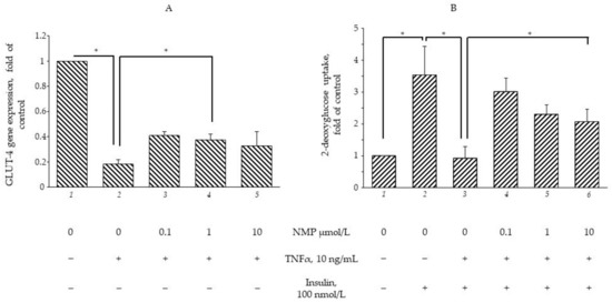 NMP attenuates TNF-α-mediated downregulation of GLUT-4 mRNA expression and improves glucose uptake. (A) SGBS adipocytes were pretreated with NMP at the concentrations indicated (5 h) and then treated with 10 ng/mL TNF-α for 18 h. Total RNA was extracted from cells, and mRNA levels of GLUT-4 were measured by qPCR using specific primers and normalized to 18S RNA. Data (means ± S.D., n = 3) are expressed as fold induction over basal (untreated) control, * p < 0.05 between groups joined by the horizontal lines. (B) SGBS adipocytes were starved for 24 h before treatment with NMP. After 5 h, cells were made insulin-resistant by exposure to TNF-α for 18 h and then stimulated with 100 nmol/L insulin for 1 h. Next, cells were washed and incubated with fluorescent glucose analogue 2-(N-(7-nitrobenz-2-oxa-1,3-diazol-4-yl)amino)-2-deoxyglucose (2-NBDG) for 1 h at 37 °C. After washing, fluorescence activity remaining in the cells was measured by a fluorescence microplate reader. Data (means ± S.D., n = 3) are expressed as fold induction over basal (untreated) control. * p < 0.05 between groups joined by the horizontal lines.
