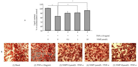 NMP modulates lipid accumulation reverting TNF-α lipolytic activity. Fully differentiated SGBS adipocytes were pretreated with NMP for 5 h and then were treated with 10 ng/mL TNF-α for 3 days. Intracellular lipid accumulation was evaluated by Oil Red O (ORO) staining. (A) Spectrophotometric quantification of ORO stain extracted from SGBS adipocytes. (B) Microphotographs of ORO staining of SGBS adipocytes. Data (means ± S.D., n = 3) are expressed as percentage over basal (untreated) control. * p < 0.05 between groups joined by the horizontal lines.