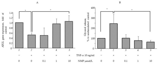 It is well known that inflamed insulin-resistant adipocytes are characterized by low lipogenic capacity and high lipolytic activity, which causes increased FFA release [30]. In an attempt to simulate in vitro the pro-inflammatory deregulation of lipid metabolism, we exposed fully differentiated SGBS cells to TNF-α for different times (from 1 to 72 h) before measuring the intracellular lipid content by using ORO staining. In a preliminary set of experiments, we observed that three day-exposure to TNF-α maximally reduced cellular lipid content (data not shown), and therefore we chose this time in the following experiments aimed at evaluating the potential anti-lipolytic activity of NMP. As shown in Figure 4A, cell exposure to TNF-α for 72 h reduced the total intracellular lipid content (bar 2 vs. bar 1, p < 0.05), which was also highlighted by the reduced lipid droplet density on the ORO photomicrographs (Figure 4B). Pre-treatment with NMP significantly reversed TNF-α lipolytic activity. We observed that the quantity of lipid droplets increased significantly, in a dose-dependent manner, when the adipocytes were treated with NMP before TNF-α challenge (bar 3–5 vs. bar 2, p < 0.05). We next investigated whether the TNF-α-mediated reduction in the lipid content of the cells was due, at least in part, to the deregulation of the expression of the genes associated with lipolysis. We observed that the cells’ exposure to TNF-α reduced the mRNA expression of ATGL) (Figure 5A), as well as the expression of HSL and CGI-58 G0S2 (data not shown). The cells’ pre-treatment with NMP reverted the TNF-α downregulation of ATGL mRNA (Figure 5A, bar 4 and 5 vs. bar 2, p < 0.05), leaving unaffected the downregulated mRNA expression of the other lipolytic genes assessed (data not shown). In line with these results, TNF-α per se induced a significant increase in glycerol release (Figure 5B, bar 2 vs. bar 1, p < 0.05). Again, the cells’ pre-treatment with 0.1–10 µmol/L NMP prevented the TNF-α-mediated induction of glycerol release (Figure 5B, bar 3–5 vs. bar 2, p < 0.05).
