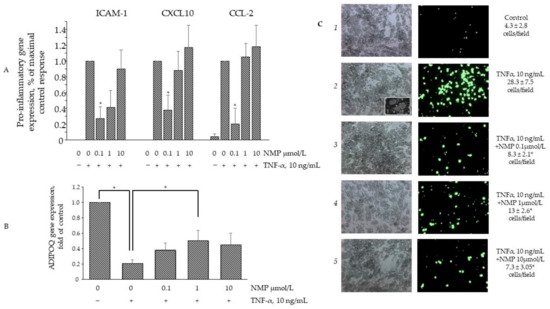 NMP attenuates TNF-α induced adipocytes inflammation. SGBS adipocytes were pretreated with NMP (4 h) and then treated with 10 ng/mL TNF-α for 18 h. (A,B) Total RNA was extracted from cells, and mRNA levels of ICAM-1, CXCL-10, MCP-1, and ADIPOQ were measured by qPCR using specific primers and normalized to 18S RNA. Data (means ± S.D., n = 3) are expressed as fold induction over basal (untreated) control. * p < 0.05 vs. TNF-α alone. (C) Fluorescently labeled suspended THP-1 (106 cells/mL) were added to the SGBS monolayers. After 1h, non-adhering cells were removed by three washes and images of SGBS and adherent calcein-labeled THP-1 cells were visualized and captured with a fluorescent microscope at 10× magnification. * p < 0.05 vs. TNF-α alone.