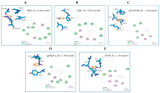 Molecular docking models of putative interactions with target proteins. Putative interactions between NMP and target proteins. (A) NMP and ERK1/2 (ERK2; PDB: 5NHV); Free energy of binding (ΔG) and affinity (Ki) are −4.63 kcal/M and 0.400 mmol/L, respectively. (B) NMP and JNK (JNK1; PDB: 2H96); ΔG −4.13 kcal/M; Ki 0.93 mmol/L. (C) NMP and p38 MAPK (p38MAPK; PDB: 6M9L); ΔG −3.95 kcal/M; Ki 1.26 mmol/L. (D) NMP and gp91phox (PDB: 3A1F); ΔG −3.9 kcal/M; Ki 1.38 mmol/L. (E) NMP and NOX4 (UNIPROT: Q9NPH5); ΔG −3.75 kcal/M; Ki 1.79 mmol/L.