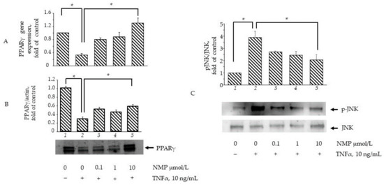 NMP attenuates TNF-α induced inhibition of PPARγ expression and activation of JNK. (A) SGBS adipocytes were pretreated with NMP (4 h) and then treated with 10 ng/mL TNF-α for 18 h. Total RNA was extracted from cells, and mRNA levels of PPARγ were measured by qPCR using specific primers and normalized to 18S RNA. Data (means ± S.D., n = 3) are expressed as fold induction over basal (untreated) control. * p < 0.05 between groups joined by the horizontal lines (B) SGBS adipocytes were pretreated with NMP (4 h) and then treated with 10 ng/mL TNF-α for 18 h. Whole-cell lysates were assayed by Western blotting using antibodies against PPARγ1 and PPARγ2, and against β-actin as a loading control. Intensity of protein bands was quantified by densitometry, and total PPARγ1 and PPARγ2 band intensities were normalized to β-actin (means ± S.D., n = 3) and presented as fold of basal (untreated) control. * p < 0.05 between groups joined by the horizontal lines. (C) SGBS adipocytes were pretreated with NMP (5 h) and then treated with 10 ng/mL TNF-α for 30 min. Whole-cell lysates were assayed by Western blotting using antibodies against pJNK and total JNK. Intensity of protein bands was quantified by densitometry; results (means ± S.D., n = 3) were expressed as pJNK/JNK, and presented as fold of basal (untreated) control. * p < 0.05 between groups joined by the horizontal lines.