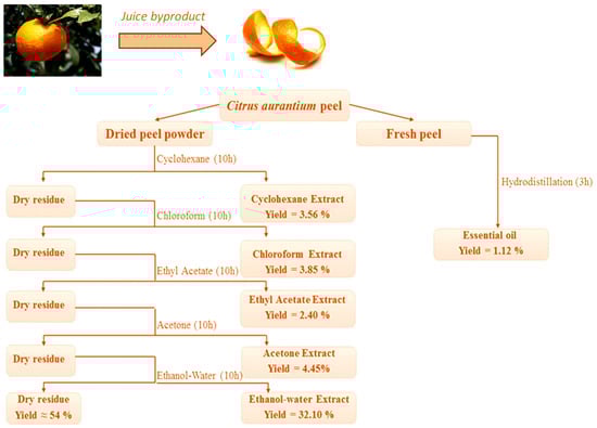 Extraction process and extraction yield by different solvents (cyclohexane, chloroform, ethyl acetate, acetone, and ethanol–water) from C. aurantium peel. Hydrodistillation of essential oil from the fresh peel.