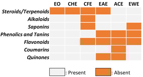 Figure 2 summarizes the secondary metabolites present in C. aurantium peel extracts for various solvents. These findings indicate that Citrus peel is an excellent source of phytochemicals that may detoxify free radicals by lowering oxidative stress [28]. Indeed, acetone extract was rich in flavonoids, phenolics, and tannins, whereas coumarins (polyphenolic compounds) were present in many extracts. Cyclohexane, chloroform, and ethyl acetate extracts were high in steroids and terpenoids, but only chloroform extract contained alkaloids. Surprisingly, quinone was only found in the extracts of ethyl acetate and acetone, whereas saponins were found in the extracts of chloroform and ethanol–water. Overall, our results are consistent with those published in the literature in many countries [7,29,30].