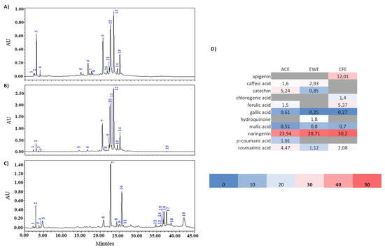 HPLC chromatogram patterns of extracts from C. aurantium L. peel: (A) acetone ((2) malic acid (0.51%), (3) rosmarinic acid (4.47%), (4) gallic acid (0.61%), (5) caffeic acid (1.60%), (6) catechin (5.24%), (8) p-coumaric acid (1.01%), (10) ferulic acid (1.50%), (12) naringenin (23.94%)); (B) ethanol–water ((1) malic acid (0.80%), (2) rosmarinic acid (1.12%), (3) gallic acid (0.25%), (4) hydroquinone (1.80%), (5) caffeic acid (2.93%), (6) catechin (0.85%), (10) naringenin (28.71%)); (C) chloroform ((1) malic acid (0.70%), (2) rosmarinic acid (2.08%), (3) gallic acid (0.27%), (6) ferulic acid (5.37%), (7) naringenin (30.20%), (9) chlorogenic acid (1.40%), (19) apigenin (12.01%)); and (D) relative quantification (%) of individual compounds identified in each extract.