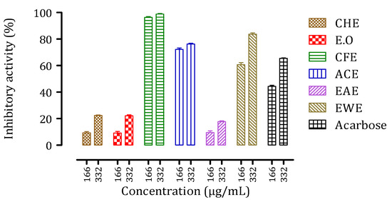 The antidiabetic activity of intestinal α-glucosidase was investigated in vitro at two concentrations (166 g/mL and 332 g/mL) of samples from the peel of C. aurantium, with the results shown in Figure 5. The extracts EWE, ACE, and CFE all inhibited α-glucosidase activity in the same way as the control drug (Acarbose). The activity of the other three samples CHE, EO, and EAE was lower than that of the reference. CFE appeared to be the most potent of all the extracts, with an inhibitory activity of over 100% at 332 g/mL. We observed that the effect of increasing extract concentration is significantly more noticeable for less active extracts than for more active extracts.