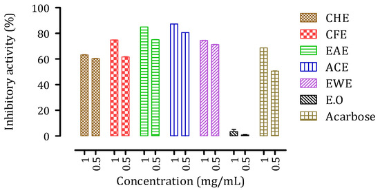 The assays for pancreatic α-amylase were performed at two concentrations (0.5 mg/mL and 1 mg/mL). As shown in Figure 6, the assays confirmed the inhibitory capacity of Citrus peel extracts in vitro. Except for the essential oil (EO), which showed almost no activity even at the highest concentration, all of the extracts studied showed remarkable inhibitory activity (ranging from 60% to 90%). Furthermore, these Citrus peel extracts showed higher inhibition capacity than that of Acarbose. Surprisingly, the concentration of the extracts had only little effect on the inhibitory activity against this enzyme.