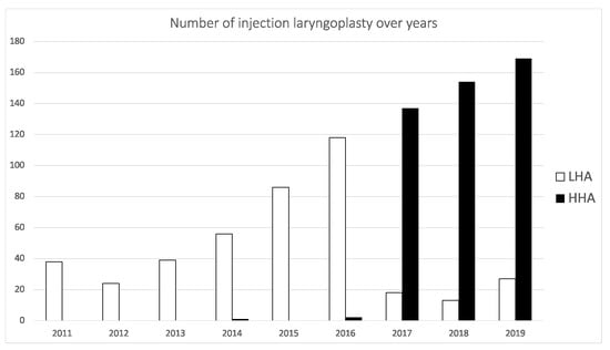 Number of injection laryngoplasties in the two HA groups over years. HHA = high-concentration HA group; LHA = low-concentration HA group.