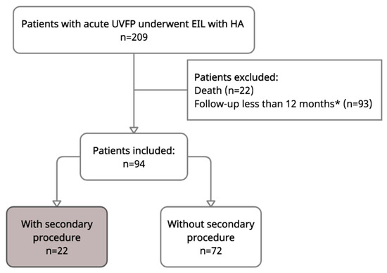 Two hundred and nine patients underwent injection laryngoplasty during the study period. One hundred and fifteen patients were excluded due to a follow up of less than 12 months, death, or spontaneous recovery of vocal motions at the end of follow up. Among those, by telephone consultation, it was found that 22 patients died, 47 were not reachable, and 37 of them stated they had a stable voice and swallowing conditions; only 9 of them had a worsened voice. Ultimately, a total of 94 patients met the inclusion criteria and were included in further analysis (Figure 2). Table 1 shows the distribution of baseline characteristics. The study population consisted of 50 men (53.2%) and 44 women (46.8%) with a mean age of 56.9 years (±SD: 1.5, CI: 53.9–59.9). Fifty-six (59.6%) patients had left side vocal paralysis. Seventy-nine (84.0%) of them had iatrogenic-related UVFP, and among them, 36 (38.3%) cases were caused by thyroidectomy. Half (50.0%) of the patients were injected with high-concentration HA (Juvéderm Ultra Plus), and the other half were injected with low-concentration HA (Restylane Vital, 42 (44.7%); Perlane, 5 (5.3%)). The average time from the onset of symptoms to treatment was 3.3 (±SD: 0.17, CI: 2.9–3.6) months, and the average follow-up time was 25.1 ± 1.2 (CI: 22.8–27.4) months.