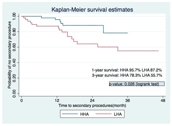 Statistical analysis was conducted using STATA (StataCorp LLC, College Station, TX, USA) version 15. Data are presented as the mean ± standard deviation (95% confidence interval) or number (percentage, %). The rate is expressed per person-year. To compare baseline characteristics between the participants with and without secondary procedures, Student’s t-test was used for continuous variables, and X2 was employed for categorical variables. We also analyzed the baseline characteristics between the two HA groups. The time courses of the secondary procedures of the two HA groups were compared using the Kaplan–Meier method, and the difference was measured by the log-rank test. A p value <0.05 was regarded as statistically significant.