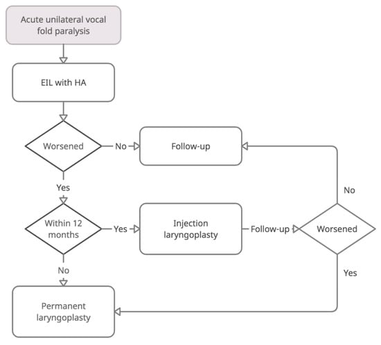 Recommendation for treatment guidelines for acute unilateral vocal fold paralysis. EIL = early injection laryngoplasty; HA = hyaluronic acid.