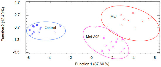 Several chemometric procedures have been used to differentiate wine composition in amino acids such as cluster analysis, principal components, and discriminant analysis. In our study, a discriminant analysis was carried out to check whether with the measured variables we could classify our samples according to the applied treatments. Four discriminant functions with a p-value less than 0.05 were calculated and therefore statistically significant with a confidence level of 95%. These four discriminant functions allowed us to 100% correctly classify the samples according to the applied treatment (Figure 1). The relative percentage for function 1 was 58.5% and 20.4% for function 2. As can be seen, the separation of the two applied treatments (MeJ and MeJ-ACP) regarding the control samples were very good (Figure 1). The two treatments were located in the central and right part of the graph, being MeJ treatment found further from the control indicating greater differences with respect to the control. The treatment carried out with the nanoparticles was located in the middle of the graph, thus resulting in intermediate values between those found in the control and the treatment with MeJ. It is logical since when we applied this treatment, we were using tenfold less concentration of MeJ than in conventional form. Nevertheless, MeJ-ACP treatment prompted to relevant differences from the control samples.