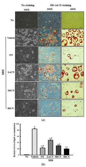 ORO staining analysis. (a) After inducing the differentiation with MDI media and treatment of α-cubebenol for eight days, 3T3-L1 adipocytes were stained with ORO dye solution. The images of the ORO-stained cells were observed under a microscope 200× and 400× magnification. (b) The optical density of red color was measured in the ORO-stained cells. Two to three wells per group were used for staining, and optical density was measured in duplicates. The data represent the means ± SD of duplicates. * indicates p < 0.05 compared to the No treated group. # indicates p < 0.05 compared to the MDI + Vehicle treated group. ORO, Oil Red O; OT, orlistat; MDI, adipogenic cocktail consisting of 3-isobutyl-1-methylxanthine, dexamethasone, and insulin; LoCN, low concentration (7.5 μg/mL) of α-cubebenol; MiCN, middle concentration (15 μg/mL) of α-cubebenol; HiCN, high concentration (30 μg/mL) of α-cubebenol.