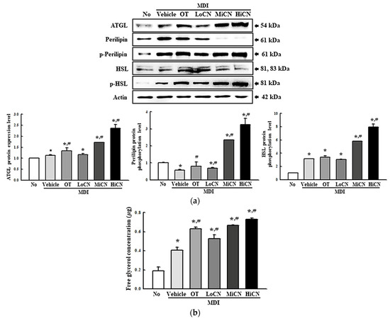 Expression of the lipolytic factors and the concentration of released free glycerol. (a) Expression level of the lipolytic proteins. After collecting the total proteins from the MDI-stimulated 3T3-L1 adipocytes treated with α-cubebenol, the expression level of ATGL, HSL, p-HSL, perilipin, p-perilipin, and β-actin were detected using the specific primary antibodies, followed by horseradish peroxidase (HRP)-conjugated goat anti-rabbit IgG. The intensity of each band was measured by an imaging densitometer, and the relative levels of each protein were calculated relative to the intensity of the actin bands. Two to three dishes per group were used to prepare the cell homogenates, and Western blot analysis was assayed in duplicate for each sample. (b) Level of free glycerol in culture media. The level of released glycerol was measured in the supernatant of the 3T3-L1 adipocytes treated with three different concentrations of α-cubebenol. Two to three wells per group were used for the assay, and the optical density was measured in duplicate. The data represent the means ± SD of three replicates. * indicates p < 0.05 compared to the No treated group. # indicates p < 0.05 compared to the MDI + Vehicle treated group. OT, orlistat; MDI, adipogenic cocktail consisting of 3-isobutyl-1-methylxanthine, dexamethasone, and insulin; LoCN, low concentration (7.5 μg/mL) of α-cubebenol; MiCN, middle concentration (15 μg/mL) of α-cubebenol; HiCN, high concentration (30 μg/mL) of α-cubebenol.