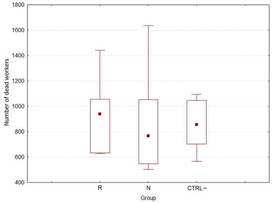 At the end of the trials after 4 weeks, the population of the 15 colonies was significantly larger (25,458.3 ± 765.5 adult bees) than the initial population (t(15) = −5.227, p < 0.000); however, the ratio between the population before and after 4 weeks was not significantly different between the groups R, N and CTRL– (H(2, n = 15) = 0.035, p = 0.983). Instead, the brood area did not change during the trial (t(15) = 0.122, p < 0.904).