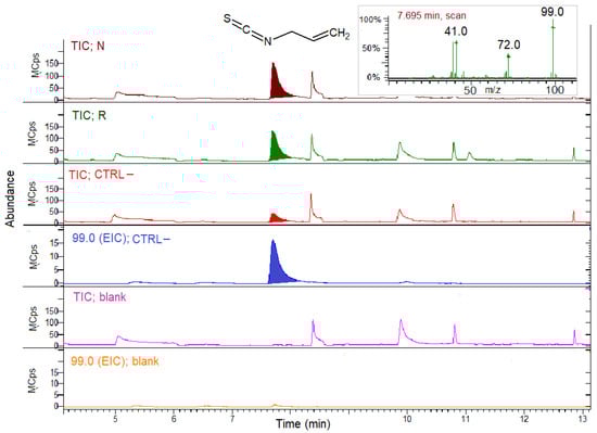 The TIC showed the occurrence of the volatile AITC peak at 7.7 min in all the samples, derived by the hydrolysis in situ of the SIN substrate in the presence of the extracts. The EIC for 99 m/z confirmed the AITC presence in all the groups, the bees fed on R or N, and in CTRL–, too. The EIC for CTRL– was reported as an example in Figure 4. Instead, no AITC was detected in the samples where the substrate SIN was incubated in the buffer in the absence of the gut extract (blank sample).