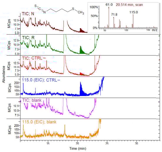 TIC shows the in situ ERITC production at 20.5 min from all the group extracts incubated with GER. No ERITC was produced from GER in the absence of extracts (blank sample). The chromatograms were expanded in order to point out the ERITC peak, which was quite small. The EIC for 115 m/z confirmed the ERITC presence in the N, R and CTRL– groups, but not in the blank sample. The CTRL– and blank EIC were reported as an example in Figure 5. Despite the similar SPME GC–MS response factors (see Section 2.6.1), the ERITC peak areas (Figure 5) were considerably lower compared to the AITC areas (Figure 4) obtained incubating the extracts with two substrates at the same analytical conditions.