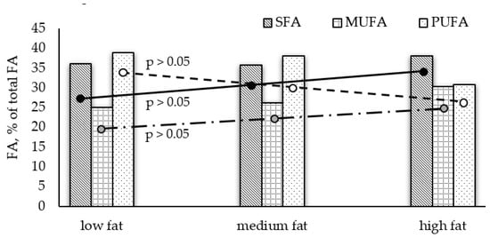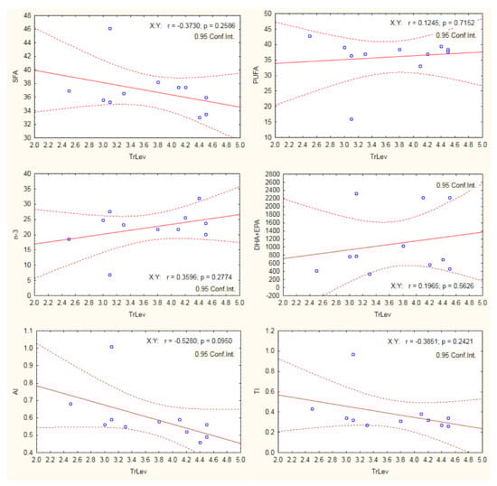 It is known that marine fish are very good sources of PUFAs [], which is confirmed by the presented results. When comparing the fatty acid profiles of species with varying lipid content, a negative relationship between TL and PUFA content was found in fish with TL < 5%; and a positive correlation between TL and SFA levels in high-fat fish (Figure 1).