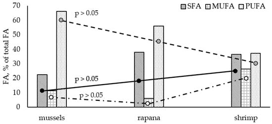 In our study, PUFA prevailed in all shellfish species. A distinctive pattern of fatty acid groups was observed: PUFA > SFA > MUFA. Similar to the Black Sea fish species, the studied shellfish contained much lower levels of MUFA compared to the other two FA groups. The highest amount of PUFA was found in the white clams (C. gallina and D. trunculus), accounting for more than 68% of total FAs, followed by M. galloprovincialis, R. venosa, and C. crangon PUFA levels. In contrast to the analyzed fish, lower SFA values were found in the studied bivalves (from 20.3% in C. gallina to 25.49% in M. galloprovincialis). R. venosa and C. crangon contained significantly higher levels of SFA—up to 37.90% (R. venosa) of total FAs. Significant differences in the mean amounts of FA groups were observed among the studied shellfish (Graph Pad Prism 6, p > 0.05, Figure 3). C. crangon contained significantly lower PUFA and higher SFAs levels than bivalves. In general, compared to the Black Sea fish species, the shellfish were characterized by significantly higher PUFA and lower SFA levels. The observed SFA profile of studied bivalves and shrimp was similar to the results obtained for the fish species. Palmitic acid (C16:0) is the predominant FA, with the highest proportions found in C. crangon (27.38% of total FAs), followed by C18:0 and C14:0. Stearic acid (C18:0) is the major SFA in R. venosa (C18:0 > C16:0 > C14:0).