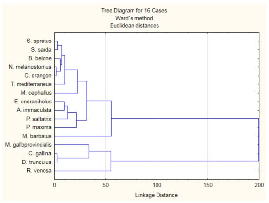 Hierarchical clustering analysis of the eleven fish and 5 shellfish species from the Black Sea.
