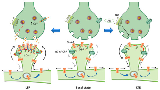 Schematic diagram highlighting the role of nanoscale sub-compartmentalization of the dendritic spine in synaptic plasticity. The “basal” state can be depicted as a homeostatic equilibrium between synthesis, lateral diffusion, internalization, degradation, and recycling of neurotransmitter receptors at the dendritic spine. Activation of α7 nicotinic acetylcholine receptor (α7 nAChR) in the hippocampus by agonist on postsynaptic sites promotes LTP (left) by depolarizing the spine which induces glutamatergic GluA1 receptors to cluster at the PSD. This incorporation of GluA1 receptor molecules further contributes to calcium entry, thus strengthening synaptic transmission. The opposite phenomenon (LTD, right) is induced by activation of presynaptic cannabinoid receptors (CBRs): neurotransmitter release is inhibited, thereby weakening synaptic transmission, and GluA1 receptors are depopulated from the PSD. ABP: actin binding proteins; AN: anandamine.
