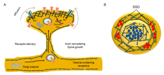 In the central nervous system (CNS), most of the excitatory synapses occur on a specialized subcellular formation in neuronal arborizations, so-called dendritic spines. These spines constitute highly differentiated subcellular compartments of the receiving (postsynaptic) neuron, concentrating in a very small volume an abundant collection of neurotransmitter receptors, enzymes, scaffolding proteins, and cytoskeletal elements. Various neurotransmitter receptor systems harbored in the spine postsynaptic membrane have been shown to be associated with liquid-ordered, raft-type lipid domains [7,8,9,10]. These lipid domains not only harbor the receptor proteins but also recruit them from extra-synaptic regions; once receptors reach the active zone of the spine, the more rigid liquid-ordered domains contribute to reducing their lateral mobility [11,12]. These neurotransmitter receptor-containing lipid assemblies have dimensions in the order of nanometers, hence the designated term “nanodomains”. The surface of the mature spine, a morphological entity of ≤1 μm diameter, is thus sub-compartmentalized into much smaller parcels that contribute to the lateral heterogeneity of the postsynaptic membrane. This description of the dendritic spine is, however, fragmentary inasmuch it does not contemplate its highly dynamic nature, especially of some of its patchy nanodomains. Thus both stable and dynamic platforms coexist in the spine postsynaptic complex, and the dynamic range of the two combined is quite ample, from a few milliseconds to days [13], providing spatio-temporal stability to some of its components while allowing fast turnover and agile redistribution in others.