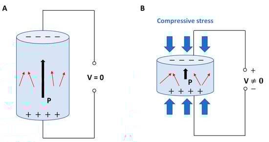 Direct piezoelectric effect in a biomaterial element: (A) without external stress, and (B) subject to compressive stress with charge generation. P: polarization vector; V: voltage; red arrows: dipoles; black arrows: direction of polarization vector.