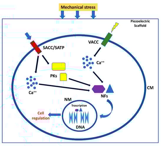 Effect of piezoelectric biomaterials on the cells. Mechanical stress compresses the scaffold or ECM generating the activation of voltage-dependent channels and channel/transmembrane proteins activated by mechanical stimuli. Calcium ions and protein kinases generate a signal cascade that in turn activate nuclear factors able to migrate in cell nuclei, generating different cell responses []. SACC = stretch activated calcium channels; SATP = stretch activated transmembrane proteins; VACC = Voltage activated calcium channels; PKs = protein kinases; NFs = nuclear factors; CM = cell membrane; NM = nuclear membrane.