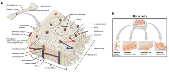 Bone tissue schematic showing: (A) bone structures (e.g., osteon, blood vessels, lamellae, periosteum, and trabeculae); and (B) the main bone cells (i.e., osteocyte, osteoblast, osteogenic cell, osteoclast) and their location. Adapted from OpenStax.