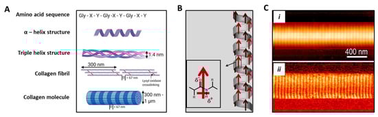 Structure and piezoelectric behavior of collagen molecule. (A) Hierarchical schematic showing the amino acid sequence in which X and Y are usually proline and hydroxyproline, thus being able to form a unique α helix secondary structure. Fibrillar collagen is a triple helix containing crosslinks formed through the action of lysyl oxidase. Collagen fibrils form fibers with varying thickness and a D-banding pattern of 67 nm. Adapted from [], reused under Creative Commons Attribution (CC BY) license. (B) Schematic showing permanent polarization in α-helix. Red arrows indicate the direction of the dipole moment. Adapted from [], reused under Elsevier & Copyright Clearance Center (license number 5185310303078). (C) Single collagen fibril analysis obtained via atomic force microscopy: (i) topography, and (ii) corresponding shear piezoelectricity obtained under piezoforce microscopy mode. Reprinted with permission from [], Copyright 2009, American Chemical Society.