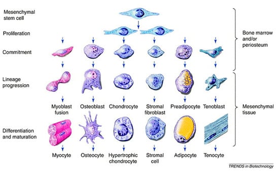 Schematic of the mesengenic process showing MSCs upstream and their differentiation capacity across diverse mesoderm tissues, including bone. Reprinted with permission from [], under Elsevier and Copyright Clearance Center (license number 5166410951759).