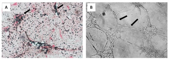 Osteogenic and vasculogenic potential of dental pulp MSCs: (A) von Kossa staining of osteo-differentiated dental pulp MSCs, showing calcium deposits in black and cells in red. Arrows point to representative areas of intense mineral deposition in proximity to osteoblasts; and (B) light micrograph of dental pulp MSCs after endothelial differentiation, showing capillary tube-like structures. Reprinted with permission and adapted from [], under Elsevier and Copyright Clearance Center (license number 5166500137992).