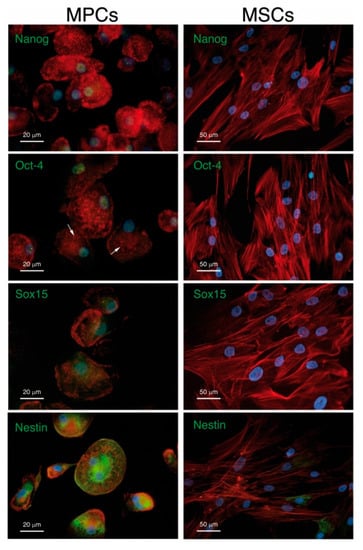 MPCs versus MSCs. Immunofluorescent staining confirms the expression of Nanog, Oct-4 and Sox15 (green) in MPC but not in MSC nuclei (blue) MPCs and MSCs show different spatial organization of F-actin (red). MPCs also differ from MSCs due to their unexpected high expression of well-organized Nestin filaments (green). Reused from [] under Creative Commons Attribution License.