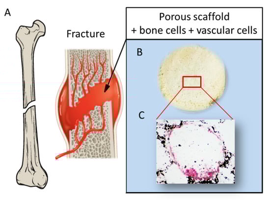 Schematic showing: (A) a fracture involving bone tissue including vasculature; (B) a porous scaffold; and (C) histological analysis displaying a pore colonized by a dual cell population: osteoblast-like cells producing mineral matrix (by von Kossa staining positive, in black), and endothelial cells surrounding the pore walls (von Kossa staining negative, in red), reprinted with permission and adapted from [], under John Wiley and Sons Copyright Clearance Center (license number 5170741359741).