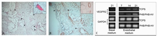 Vascularization in PHBHV-based fiber scaffolds: (A,B) PHBHV fibers after implantation in nude rats, arrows indicate the blood vessels, stars point to scaffold fibers []: (A) hematoxylin/eosin staining, and (B) 1A4 actin staining, reprinted and adapted under John Wiley and Sons Copyright Clearance Center (license number 5170801144911); and (C) PHB/PHBHV fibers cultured in vitro with adipose-derived MSCs: expression of VEGFR-2 as an endothelial marker [], reused under Creative Commons Attribution License.