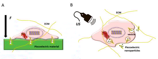 Schematic showing stem cell embedded in its extracellular matrix (ECM) and possible routes of using piezoelectric biomaterials to regulate its differentiation: (A) as substrates or scaffolds, which upon the application of an external force (F) give rise to electric stimuli in contact with the cell membrane; and (B) as nanoparticle systems trafficking intracellularly, which can be activated by ultrasound (US), thus inducing intracellular electric stimulation.