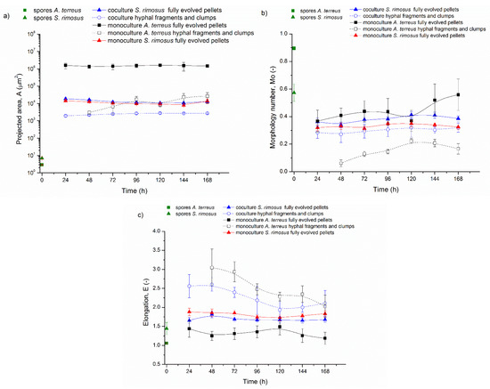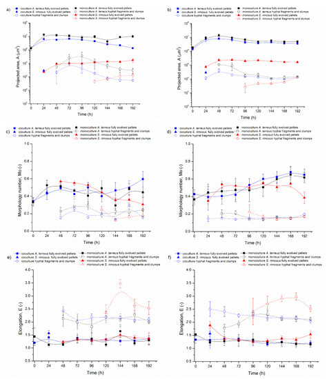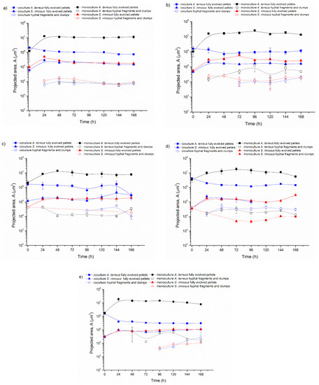At the beginning of ATSR2 (Figure 2a) in the monoculture, the projected area of the fully evolved A. terreus pellets (marked with solid black squares) was equal to 1.2 × 106 µm2 and increased over the next 24 h up to the value of 1.3 × 107 µm2. In the next hours of the cultivation, this parameter slightly decreased (A = 1.1 × 107 µm2 in 48 h) and then remained at this level. In the coculture, the projected area of A. terreus fully evolved pellets (marked with solid blue squares) showed a downward trend. Its initial value (at t = 0 h) was equal to 2.1 × 106 µm2 and in the last 168 h it decreased to 7.3 × 105 µm2.