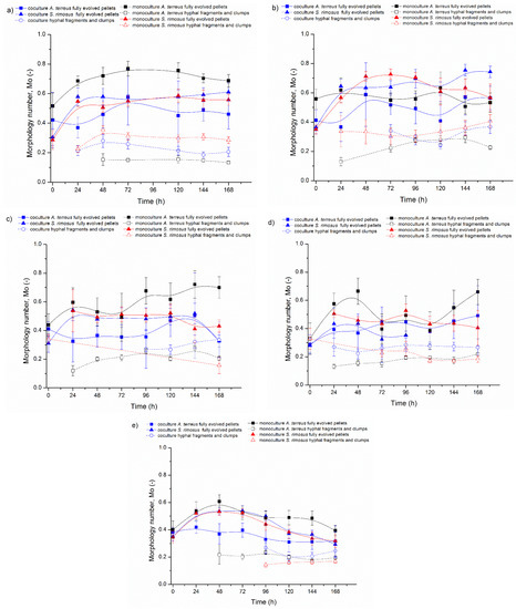Considering morphology number of S. rimosus fully evolved pellets in the experiments ATSR2 and ATSR6 in the corresponding time points (72 h), it is seen that the mono- and coculture values from the first and the last experiment were almost identical (Figure 3a,e): (1) S. rimosus monoculture fully evolved pellets Mo = 0.55 at 72 h of ATSR2 and at 72 h of ATSR6 Mo = 0.52 (p > 0.05); (2) S. rimosus coculture fully evolved pellets Mo = 0.55 at 72 h of ATSR2 and Mo = 0.54 at 72 h of ATSR6 (p > 0.05). However, after 72 h of ATSR2 and 72 h of ATSR6, the trends of the temporal changes of morphology number varied. In the ATSR2 (Figure 3a) case, monoculture parameters remained stable and in the coculture they were slightly raised. In ATSR6 (Figure 3e), morphology number decreased until the end of the experiment in both mono- and co-culture. Moreover, in ATSR3 (Figure 3b) relatively high morphology number values were observed. For example, in 72 h of ATSR3, for S. rimosus fully evolved pellets in the monoculture this parameter was equal to 0.73, and its corresponding value in the coculture was 0.64. It was evident that the changes of cultivation medium composition caused an ambiguous effect on S. rimosus pellets morphology number. Furthermore, the presence of A. terreus in the cultivation did not influence this value (Figure 3). For S. rimosus fully evolved pellets, there was no difference between morphology number in the monoculture and in the coculture.